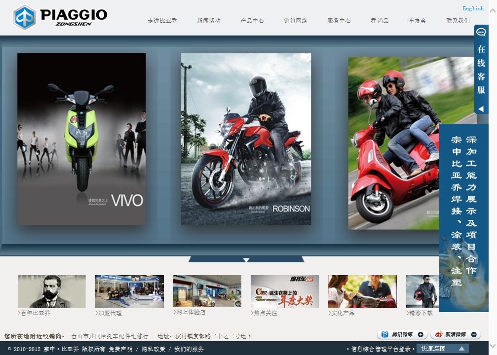 宗申·比亚乔佛山摩托车企业有限公司是由意大利比亚乔集团与中国宗申产业集团于2004年4月合资重组成立的集研发、生产、营销于一体的高科技摩托车企业,首期工程融资额2亿元人民币,注册资本2980万美元。公司位于九游娱乐·(NineGame中国)官方网站省佛山市张槎高新技术开发区,占地面积11万平方米。